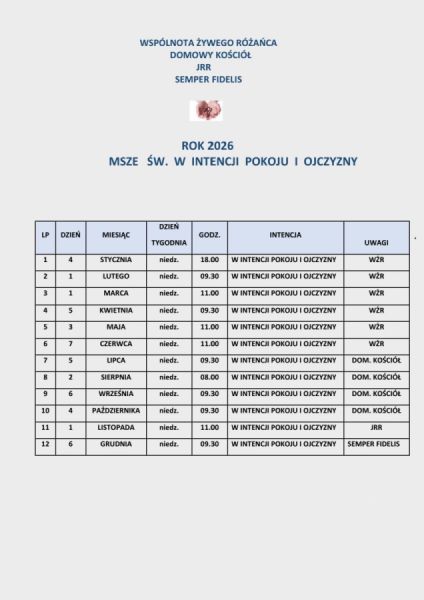 (w styczniu o 15:00, nie ma o 18:00)   W dni powszednie lipca i sierpnia:  8:30 i 18:00  (nie ma Mszy o 7:00)